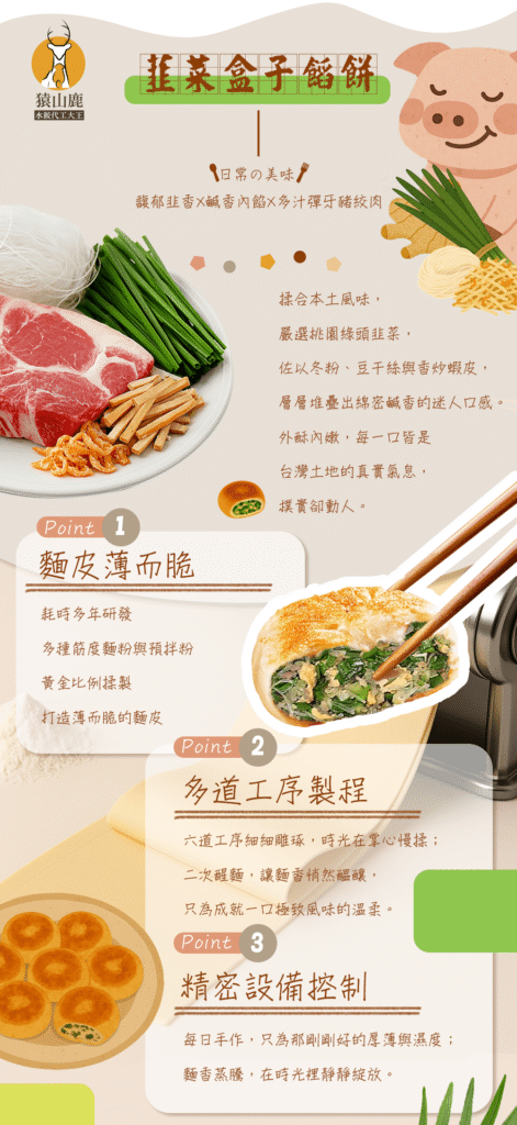 本土風味,特選韭菜,加入冬粉、豆干絲、蝦皮,口感綿密,外酥內脆,每口充滿鹹香,道地台灣味滿溢。