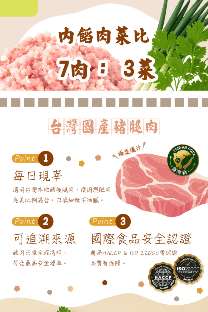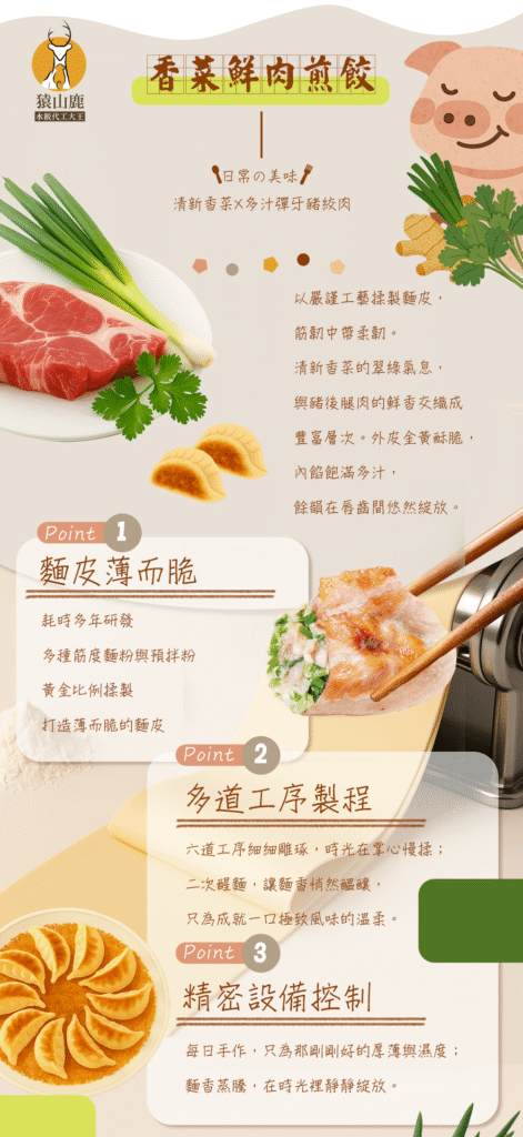 嚴謹揉捏技術打造麵皮,清新香菜風味搭配豬後腿肉鮮香交織融合,外皮金黃酥脆,內餡飽滿多汁口齒留香。