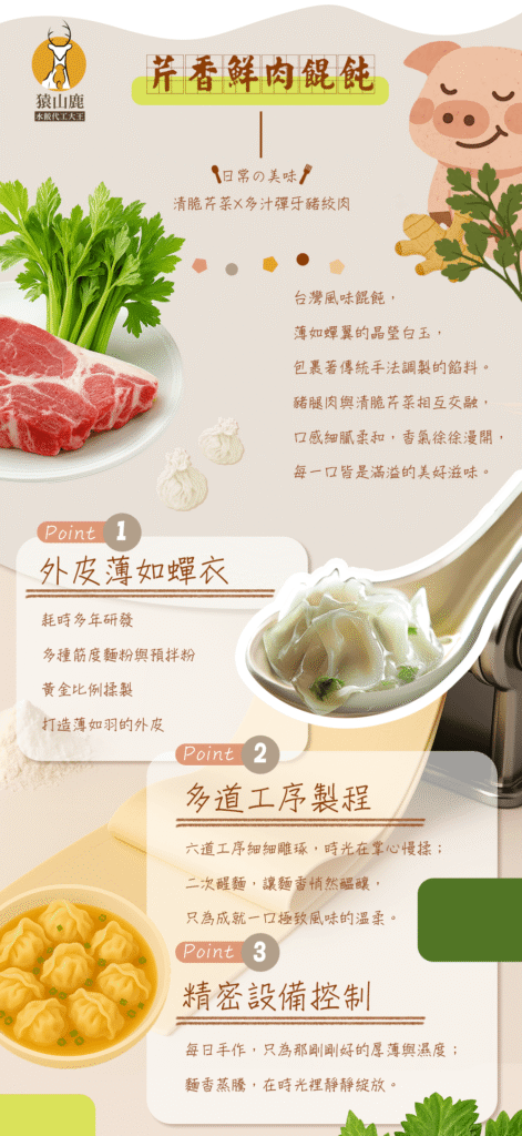 風味特色 :入口芹菜清香鮮明,鮮肉細緻多汁,清爽不膩、香氣層層堆疊,餛飩輕盈有味。